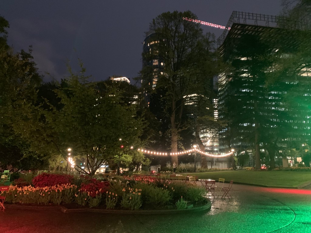 One thing she and I have made a tradition while traveling is to go to a Whole Foods. On this particular Tuesday in April we went to Whole Foods so that I could get some food to eat for dinner. We made our walk from the store up a hill through a beautiful little lit park, Denny Park, back to our hotel.